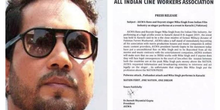 देखिए, मामला विवादों से घिरे रहने वाले सिंगर मीका सिंह का है। अभी हाल ही में सिंगर मीका सिंह ने पाकिस्तान के पूर्व राष्ट्रपति परवेज मुशर्रफ के करीबी की बेटी की शादी में प्रस्तुति दी थी, यह कार्यक्रम 8 अगस्त को हुआ था, जिसका वीडियो वायरल हो रहा है। जिसके चलते ऑल इंडिया सिने वर्कर्स असोसिएशन ने मंगलवार को मीका सिंह के खिलाफ कार्यवाही करते हुए बॉलीवुड में उन पर प्रतिबंध लगा दिया है। और साथ ही कहा है कि बॉलीवुड इंडस्ट्री में मीका के साथ कोई भी काम नही करेगा। एसोसिएशन ने अनुच्छेद 370 के मुद्दे पर भारत और पाकिस्तान के रिश्तों में तल्खी के बीच विवादों में घिरे सिंगर मीका सिंह से जुड़े प्रोडक्शन हाउस, म्युजिक कंपनी और उनके सभी एसोसिएशन का बहिष्कार किया।