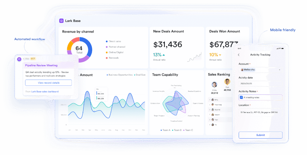 Making decisions based on all the data is hard because leaders have to guess when records are spread out across files and systems. Lark Base solves this problem by putting all of your records, workflows, and projects in one place that can be changed.