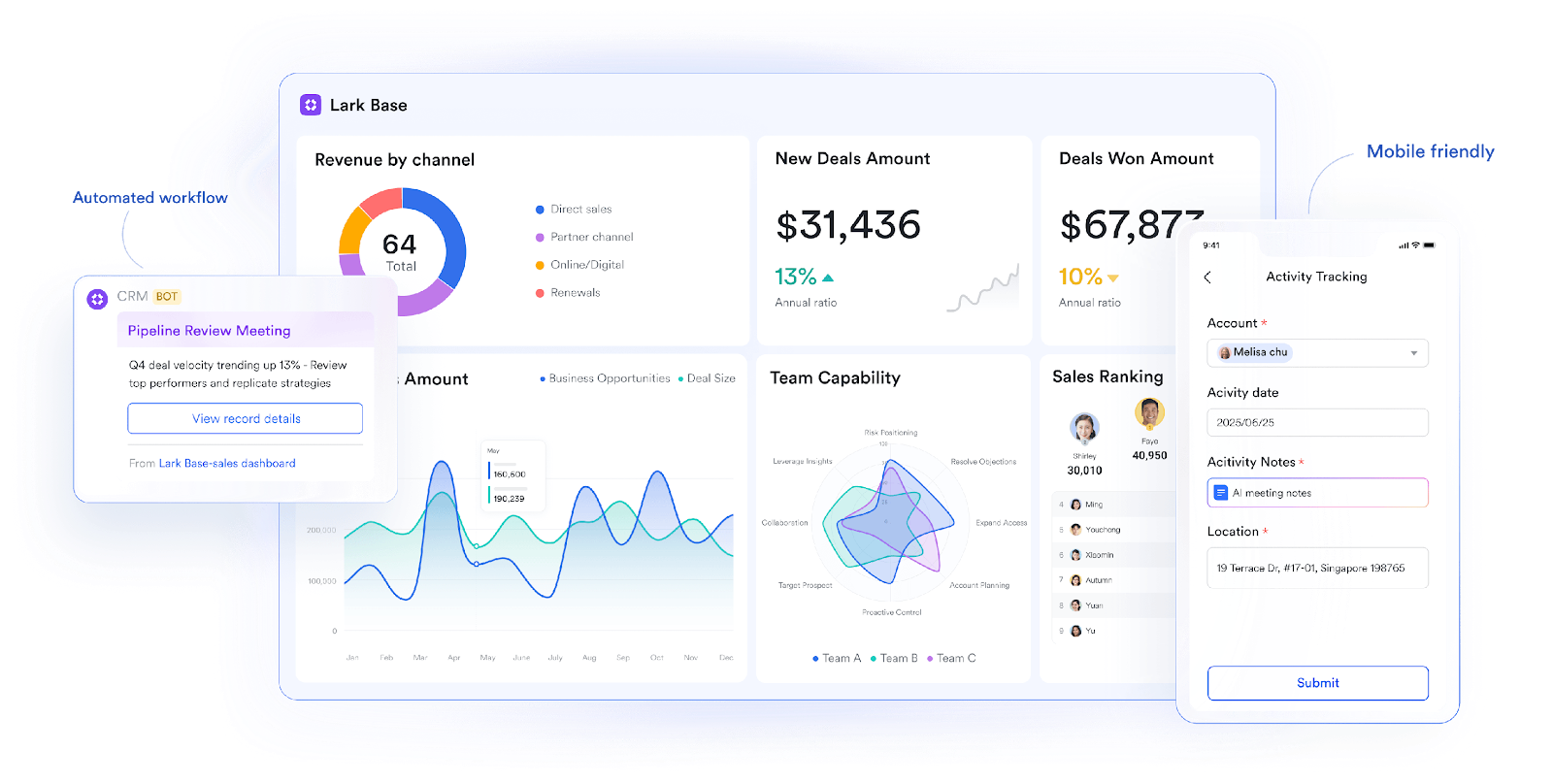 Making decisions based on all the data is hard because leaders have to guess when records are spread out across files and systems. Lark Base solves this problem by putting all of your records, workflows, and projects in one place that can be changed.